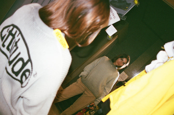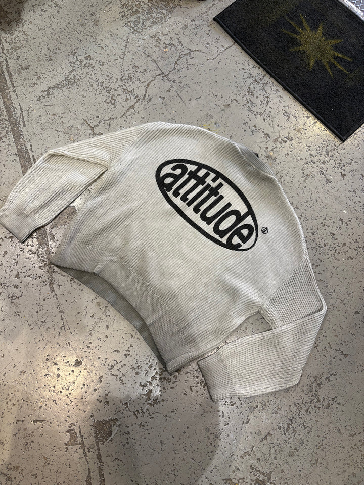 Jersey gris de punto acanalado con un corte moderno y ligeramente cropped. Presenta un llamativo estampado negro en la espalda con la palabra “attitude” en un diseño ovalado que le da un aire urbano, contundente y con personalidad. El contraste entre el gris suave del tejido y el negro profundo del gráfico crea un estilo atrevido y actual, perfecto para looks streetwear.